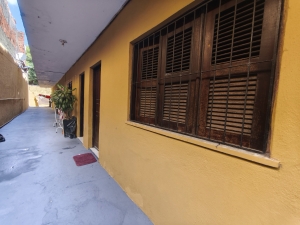 Sala ampla dois ambientes com janelas largas e vista livre, cozinha, área de serviço e 1 quarto grande com banheiro privativo.